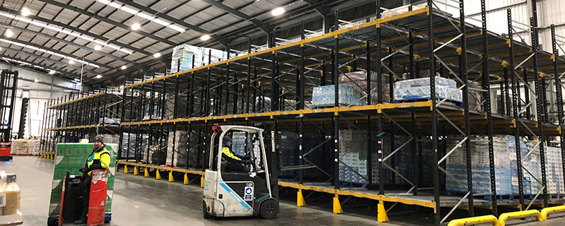 Pallets are stored in a block system on heavy duty roller beds. Pallets are loaded onto dedicated lanes of inclined gravity rollers. When a load is taken from the picking face the next pallet rolls into position. Pallet movement is controlled by brakes and speed controllers fitted within the roller tracks.